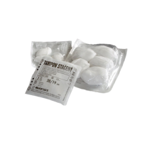 hydrofilní gáza Charakteristika: Tampon je bělená hydrofilní gáza stočená do tvaru vejce, 100% bavlna, tkaná shustotou 17vláken/cm2. Vyrábí se vucelené řadě 11ti základních velikostí. Rozměr tamponu je odvozen od velikostí gázového přířezu, ze kterého je tampon stáčen. Tampony jsou pevné a spolehlivé při použití. Nesterilníverze. Použití: Vhodný..